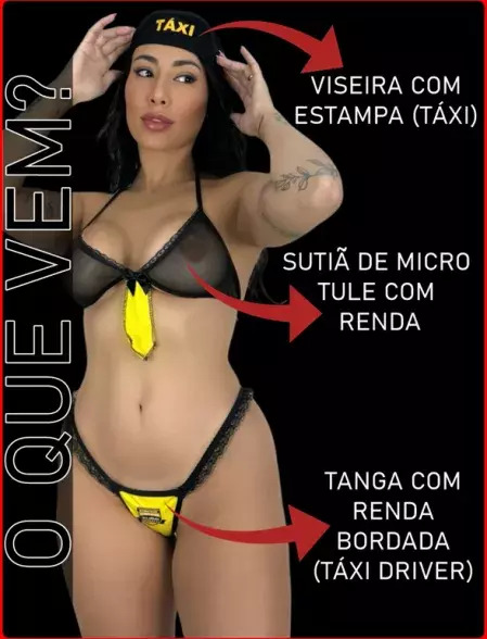 Dê um toque especial a sua vida íntima com esta deslumbrante mini fantasia táxi, confeccionada em helanca com um amarelo bem vibrante, com detalhe de táxi bordado na tanga, micro tule importado e viés ajustável no sutiã, que remete as loucas travessuras. Destaque para o design da peça e a gravatinha, que fará você se sentir mais sexy e atraente. Seu design exclusivo permite que se ajuste perfeitamente ao corpo, vestindo do tamanho P ao G. Modelo ideal para mulheres ousadas que gostam de usar coisas diferentes e surpreender a pessoa amada.